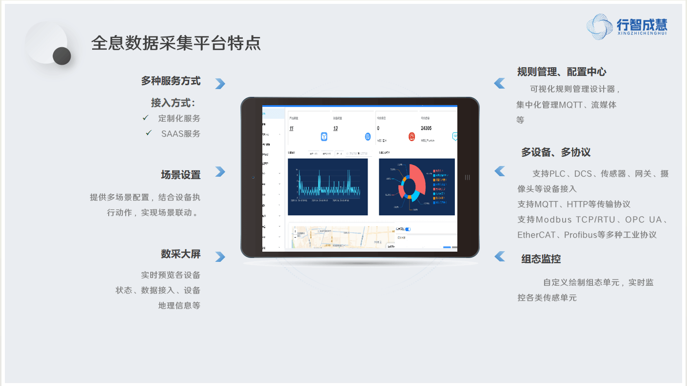 全息数据采集平台具备丰富特点,其提供定制化服务、SAAS 服务等多种服务接入方式,支持多场景配置,结合设备执行动作实现场景联动,数采大屏可实时预览各设备状态、数据接入、设备地理信息等;